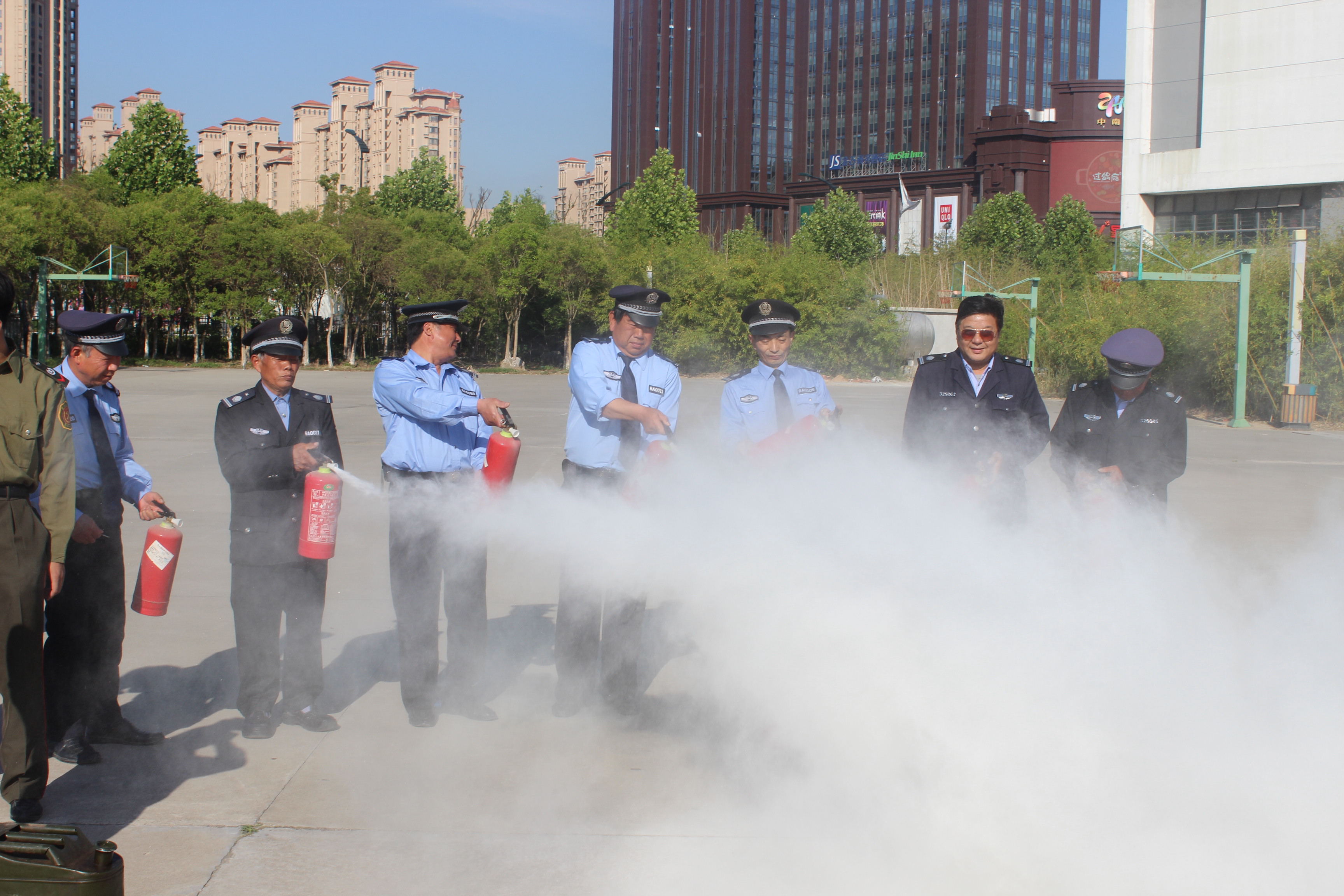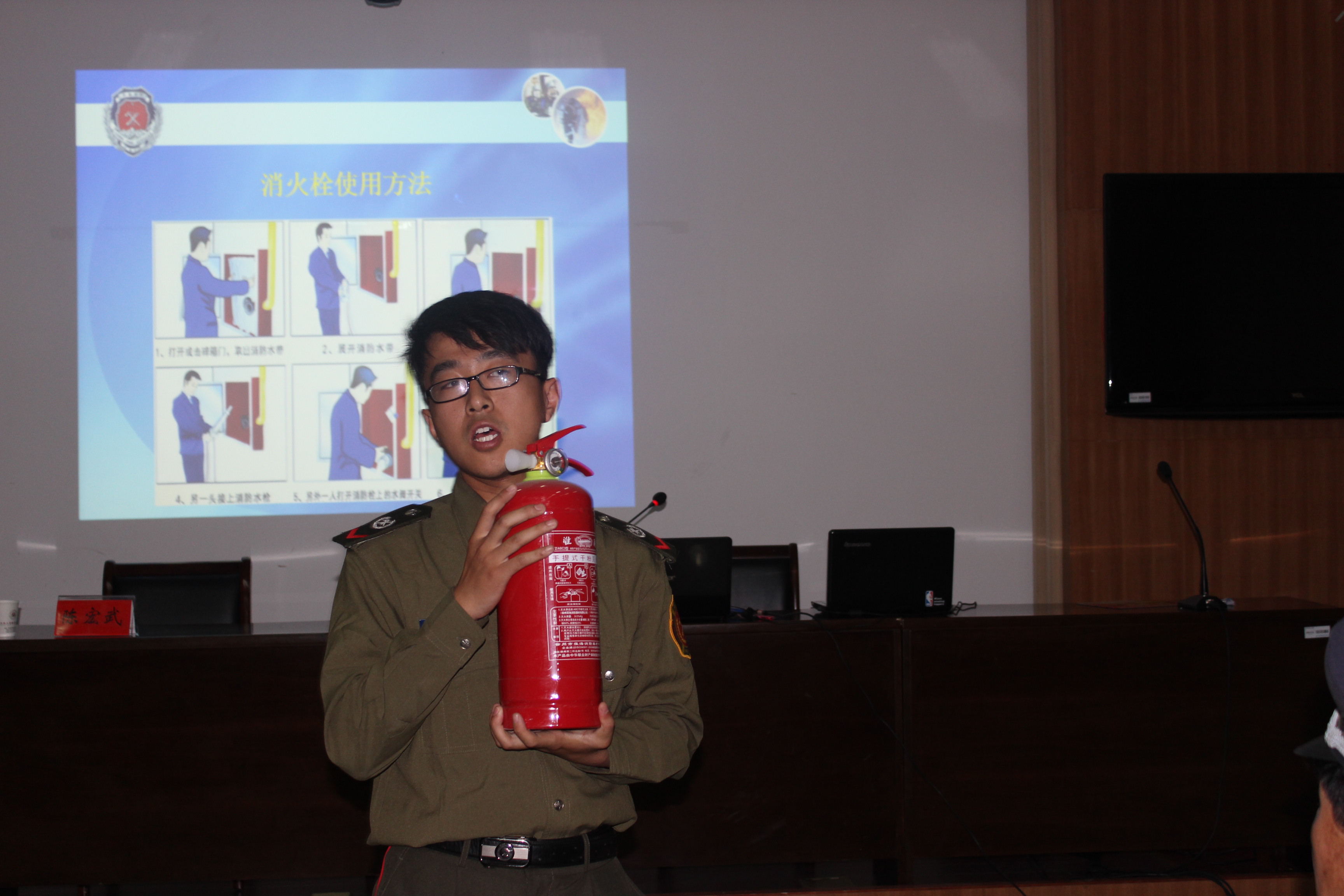 首先,朱永国为大家讲解了基本消防安全制度,并简要介绍了相关法律法规,旨在使大家形成基本消防观念。而后,朱永国结合实际案例,并配合一幅幅触目惊心的图片,一段段发人深省的视频,生动的讲解了消防安全知识。接着,朱永国为大家讲解了基本消防设施的使用,并到学校操场现场演示手提式干粉灭火器的使用,同时指导安保工作人员现场进行灭火演练。