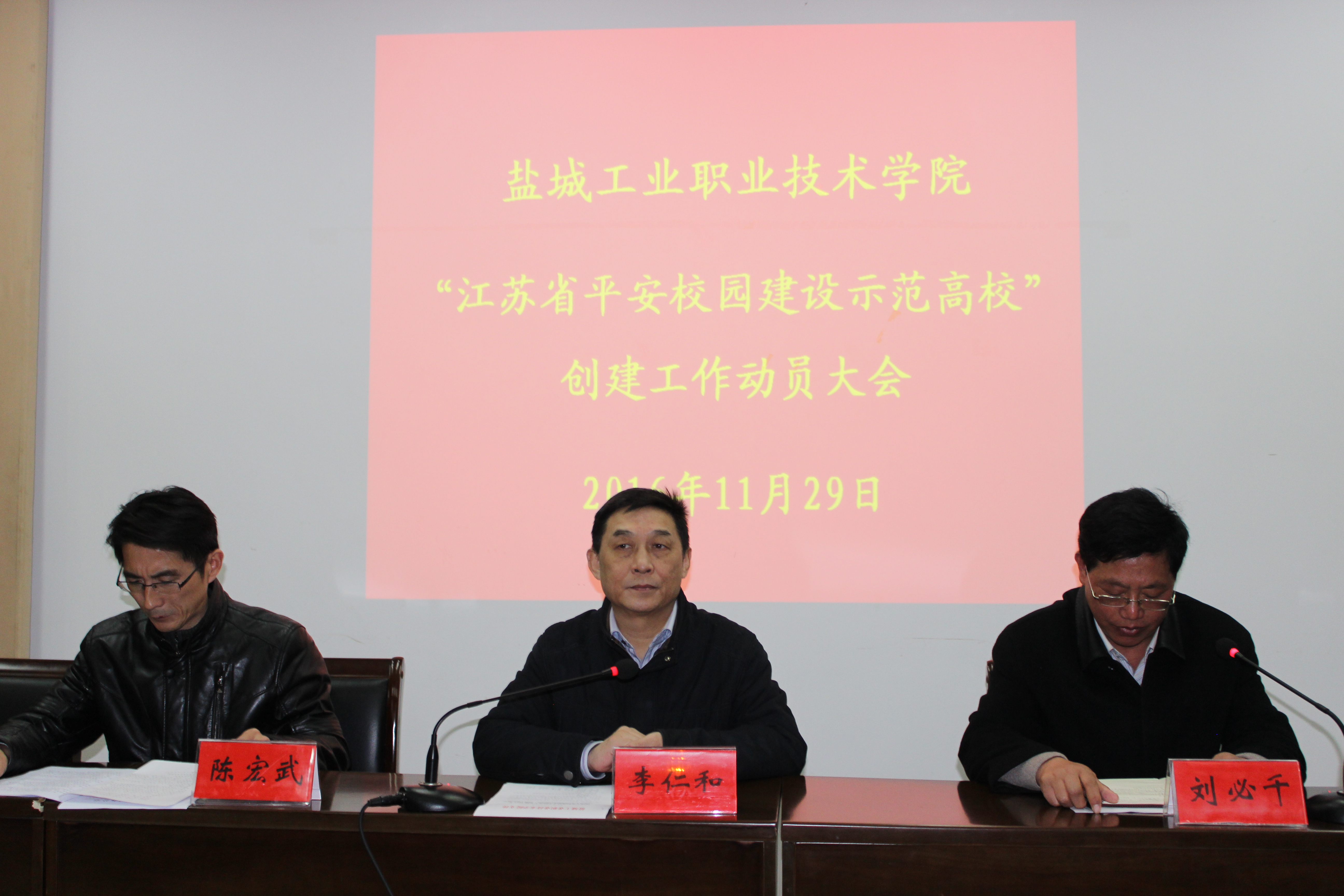 11月29日下午四点,我校在图文中心一楼第三会议室召开2016年“江苏省平安校园建设示范高校”创建工作动员会,学校校长李仁和、校园治安综合治理领导小组成员参加了会议。会议由副校长刘必千主持。