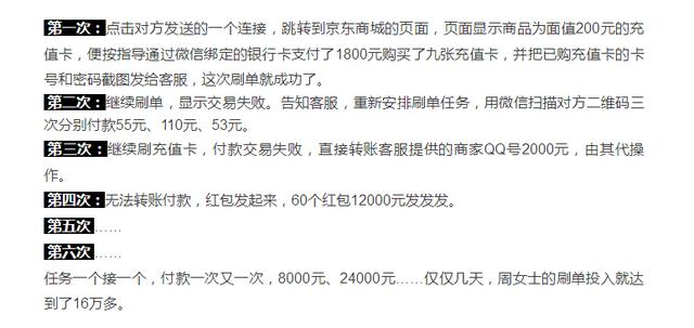 周女士就这样前后刷了16万多!钱投了那么多,期待的报酬一分都没拿到,周女士猛然惊觉不好,联系客服要求支付本金和酬劳,得到的回复却是还得继续刷单,不继续完成任务无法支付本金和酬劳。这就是一个“无底洞”啊,周女士这才意识到自己被骗了。