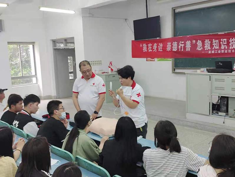 盐城市红十字会的陆仁平老师简要介绍了红十字精神和红十字会的性质、宗旨、方针、目标,对常见生活意外及急救措施进行了讲解,重点介绍了心肺复苏、海姆立克急救法的相关流程、注意事项,并科普了溺水等意外伤害的急救措施。吴向华等老师在现场通过模拟人对心肺复苏术的步骤、胸外按压的手法、AED自动体外除颤仪的使用方法、海姆立克急救法进行了详细讲解和示范。随后,大家在老师们的专业指导下,进行分组实操演练,一一进行考核。