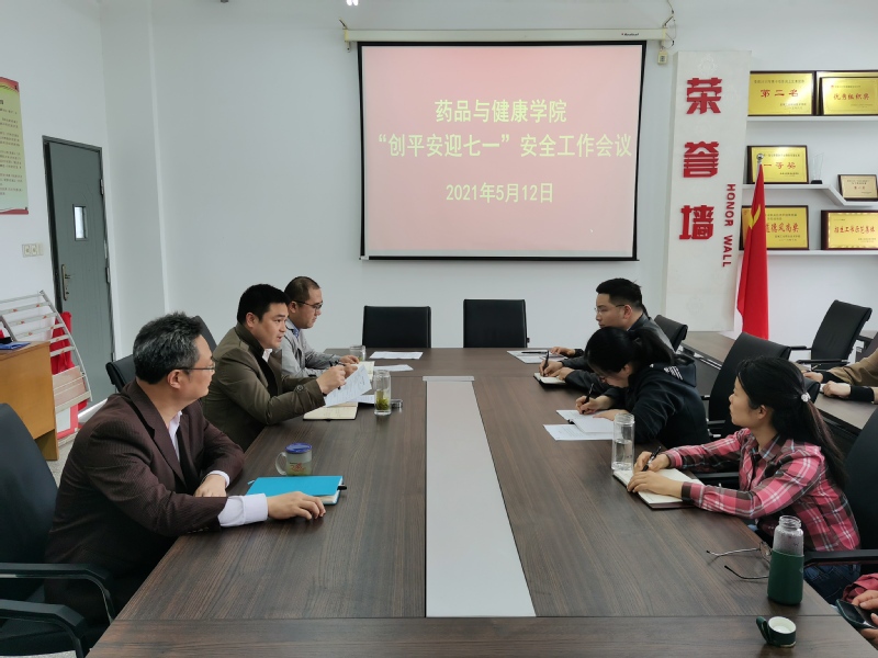 5月12日,药品与健康学院在305会议室召开“创平安,迎七一”安全工作会议,院长刘德驹、党总支副书记杨勇、副院长朱驯、以及学院全体教职员工参加会议,会议由杨勇主持。