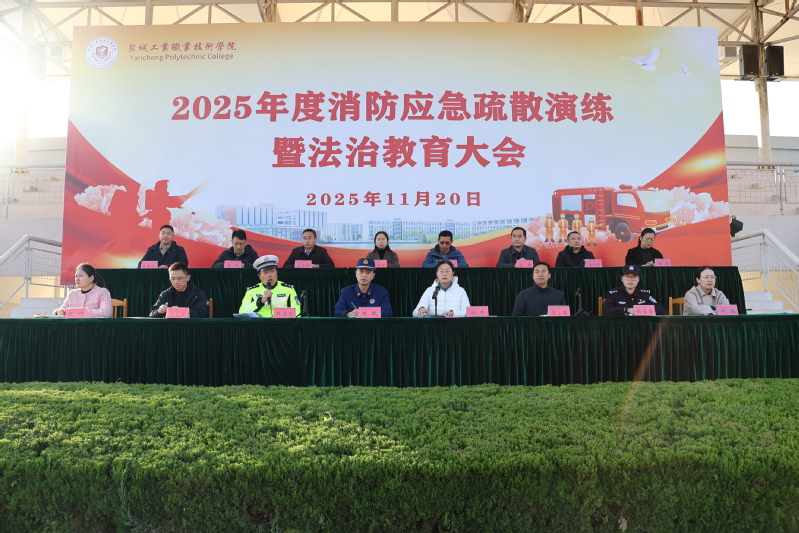 11月20日,学校与盐南消防救援大队、盐南公安分局联合举行了2025年度消防应急疏散演练暨法治教育大会。校党委委员、学工处处长杨彦、盐南消防救援大队科城消防站站长陈乾、盐南公安分局六大队科城中队中队长赵金忠、科城派出所社区队指导员杨蓉蓉等出席活动。